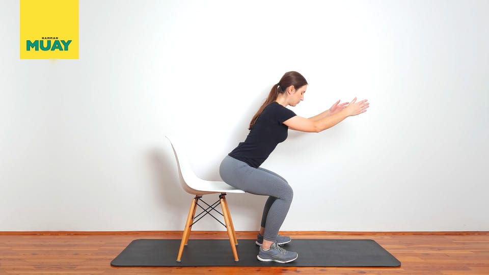 Tenez-vous devant une chaise solide, les pieds écartés à la largeur des épaules, et abaissez-vous comme pour vous asseoir, en gardant la poitrine relevée et les genoux alignés avec les orteils, touchez légèrement la chaise sans vous asseoir.